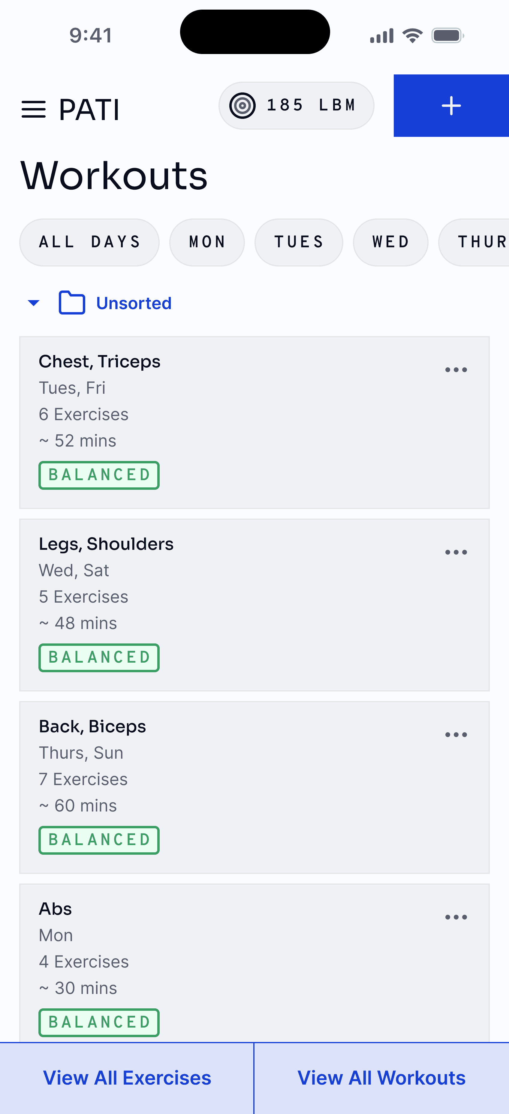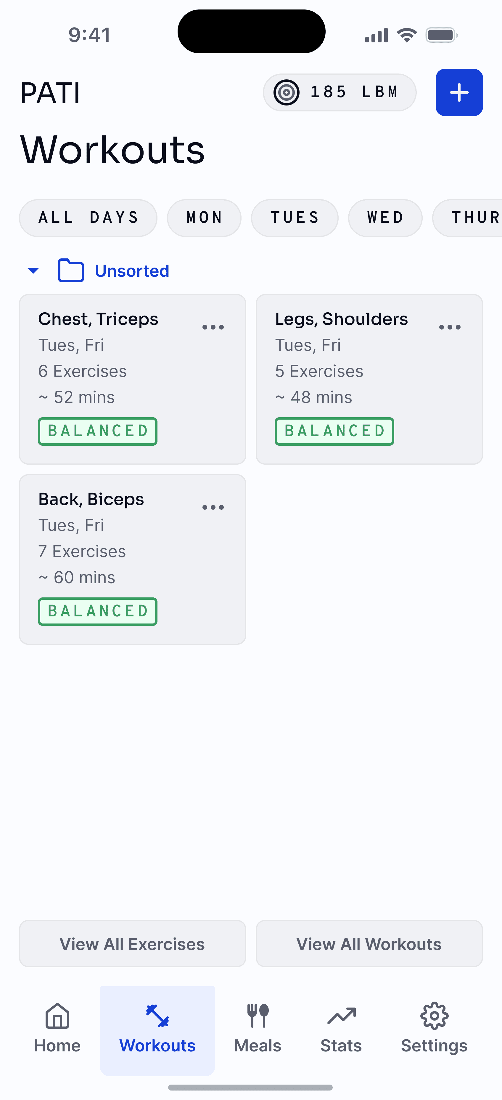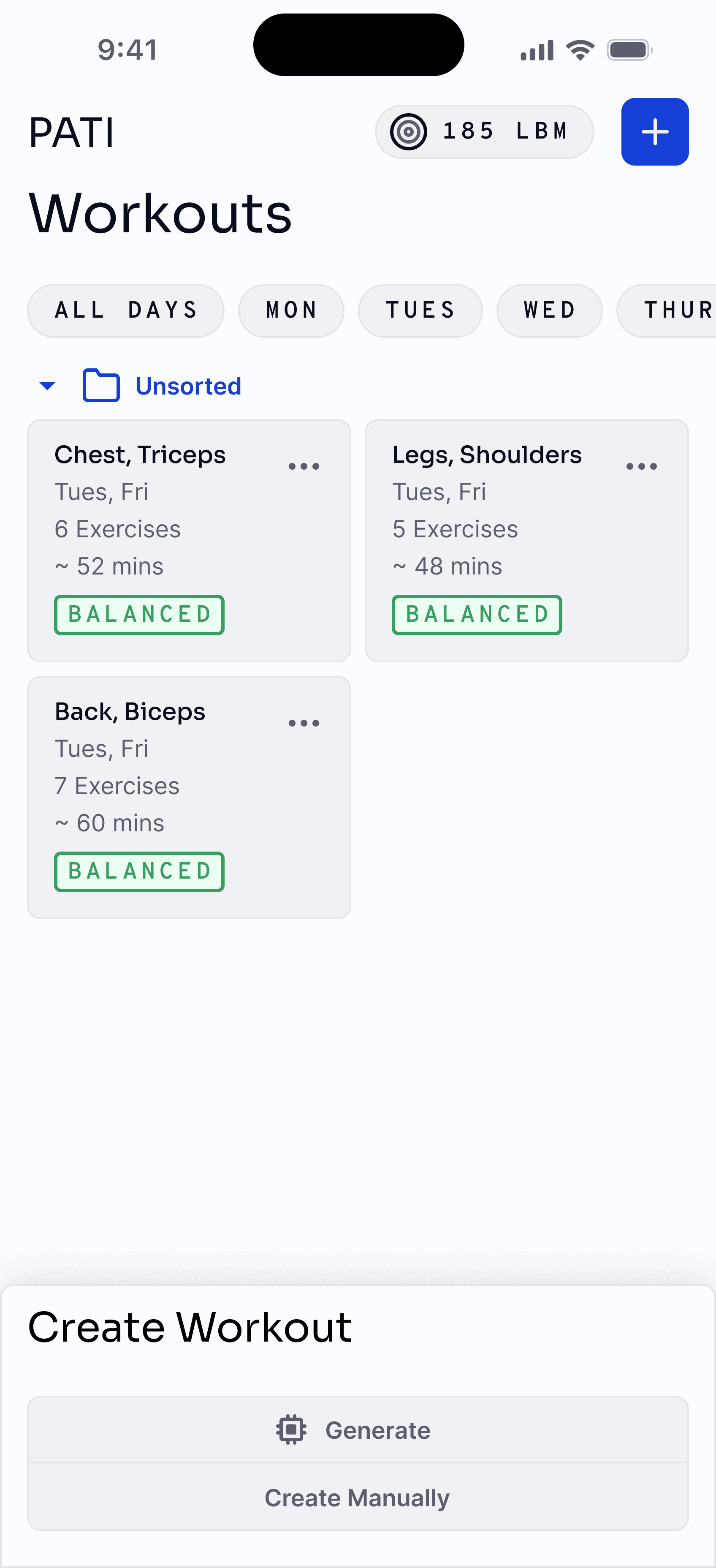 PATI aims to be a central hub for all fitness activities. This includes planning workouts. Some users might not know where to start. To usher them into a safe and effective workout routine, we can configure various exercises together and use calculations like optimal volume to lift, strength standards and the like to create workouts that suit the user's preferences.
