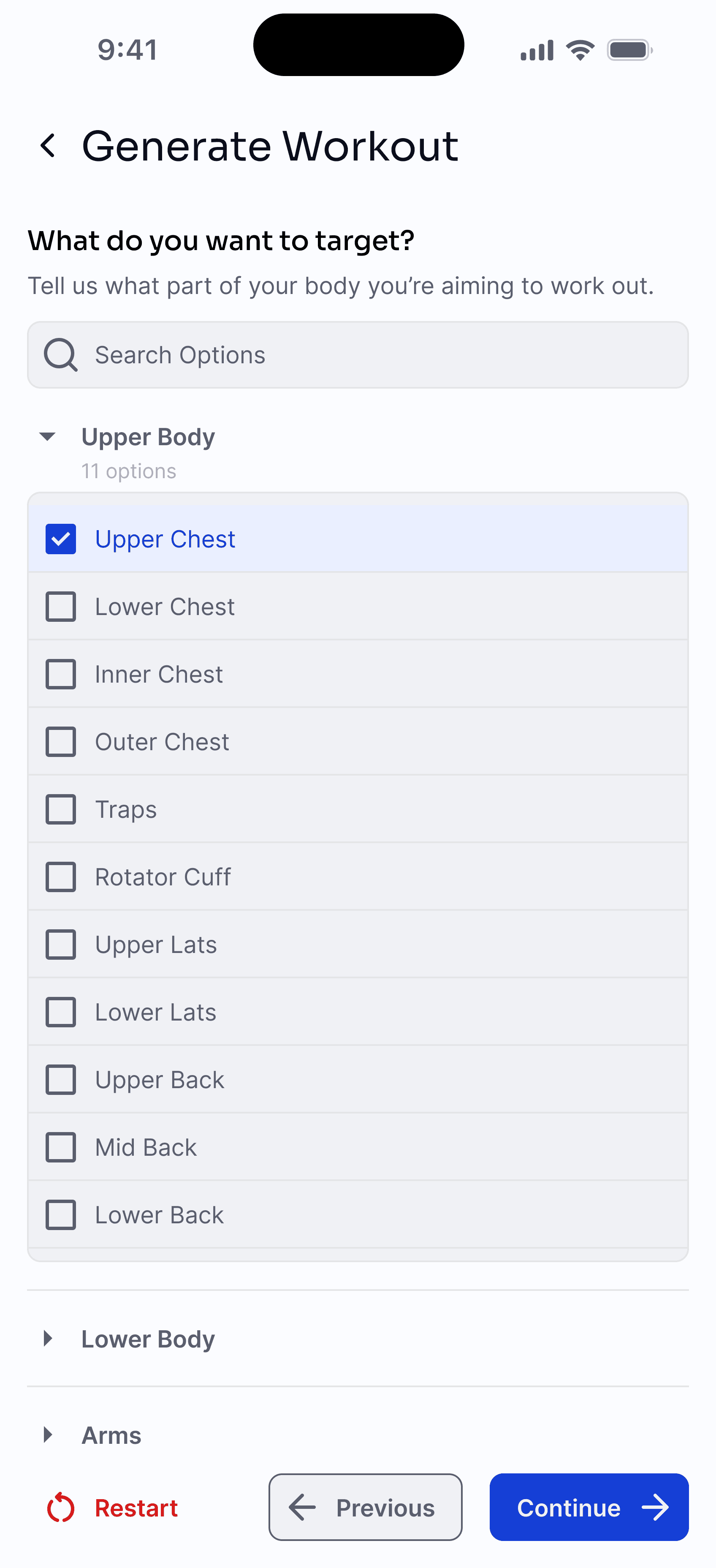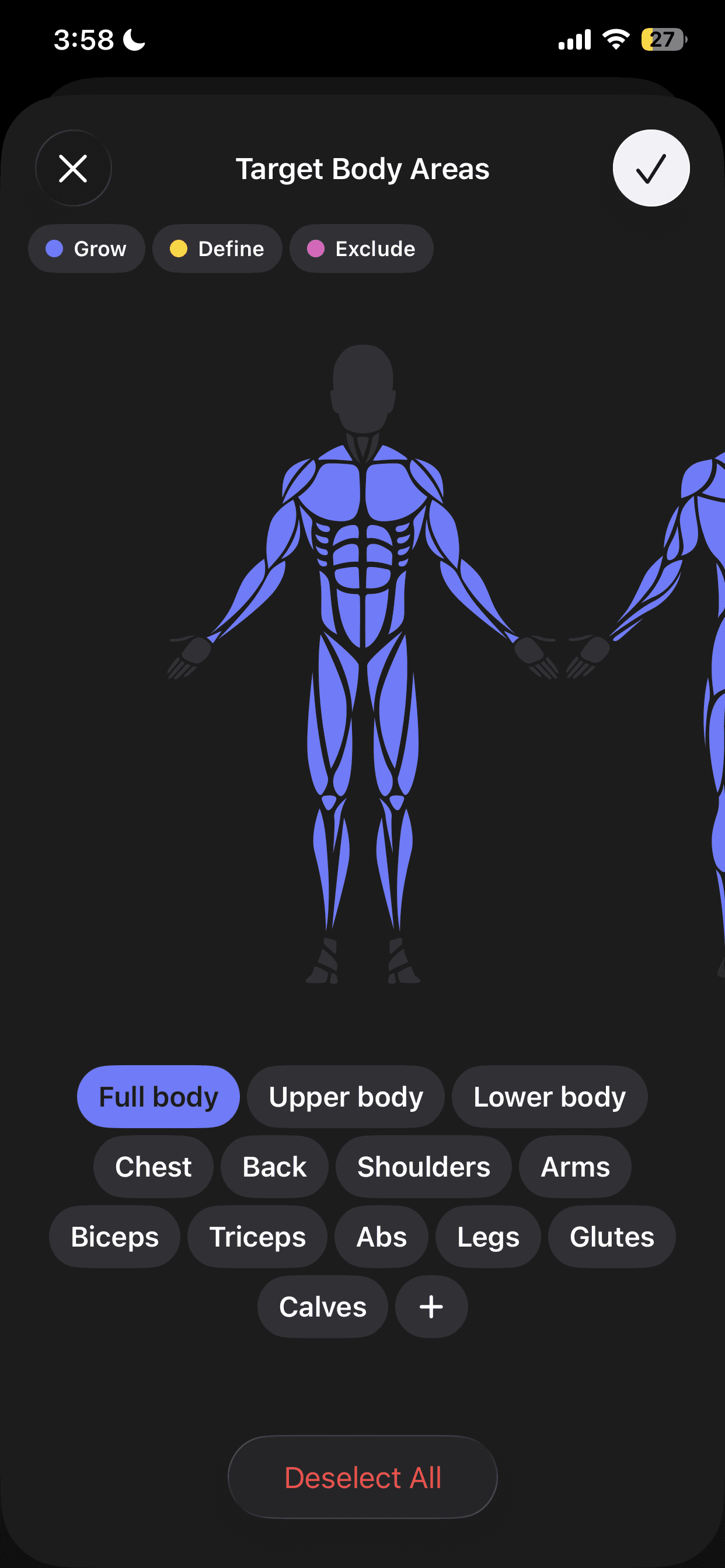 Setgraph clearly outlines targeted body parts when generating workouts, but its goal-setting lacks depth and relies on crude metrics like body weight, which don’t reflect lean mass. Logging reps and weights feels overwhelming due to excessive options, colors, icons, and information density. Tight click areas further hurt usability and make interactions frustrating.