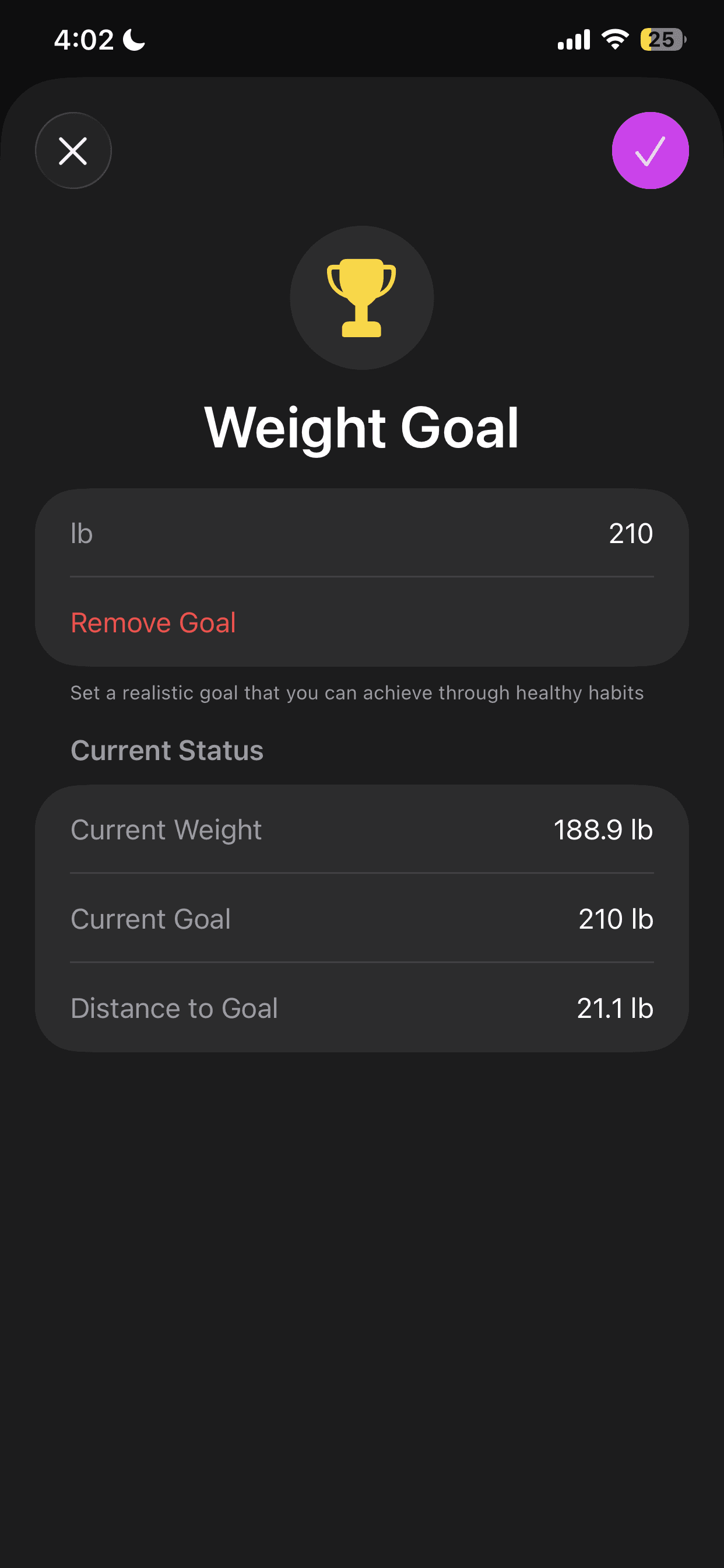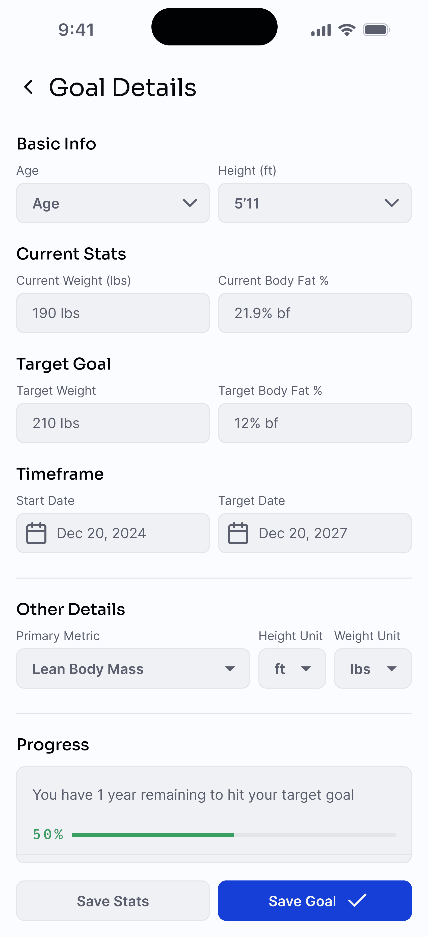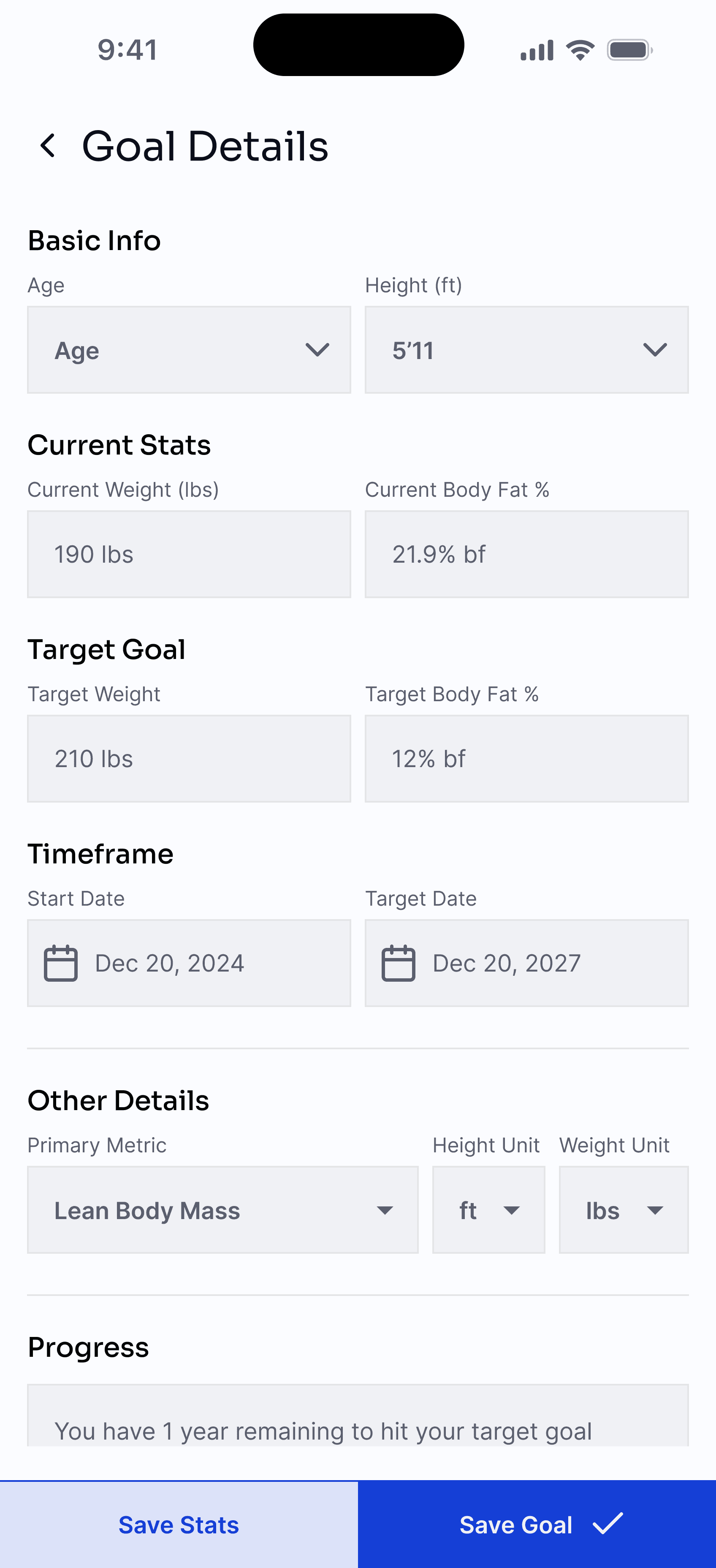Users can access their goals from any screen via the “Goal Unset” chip in the top-right. From there, they can configure current and target stats then, save their changes and either stay on the Goal Details page or return to the previous tab.