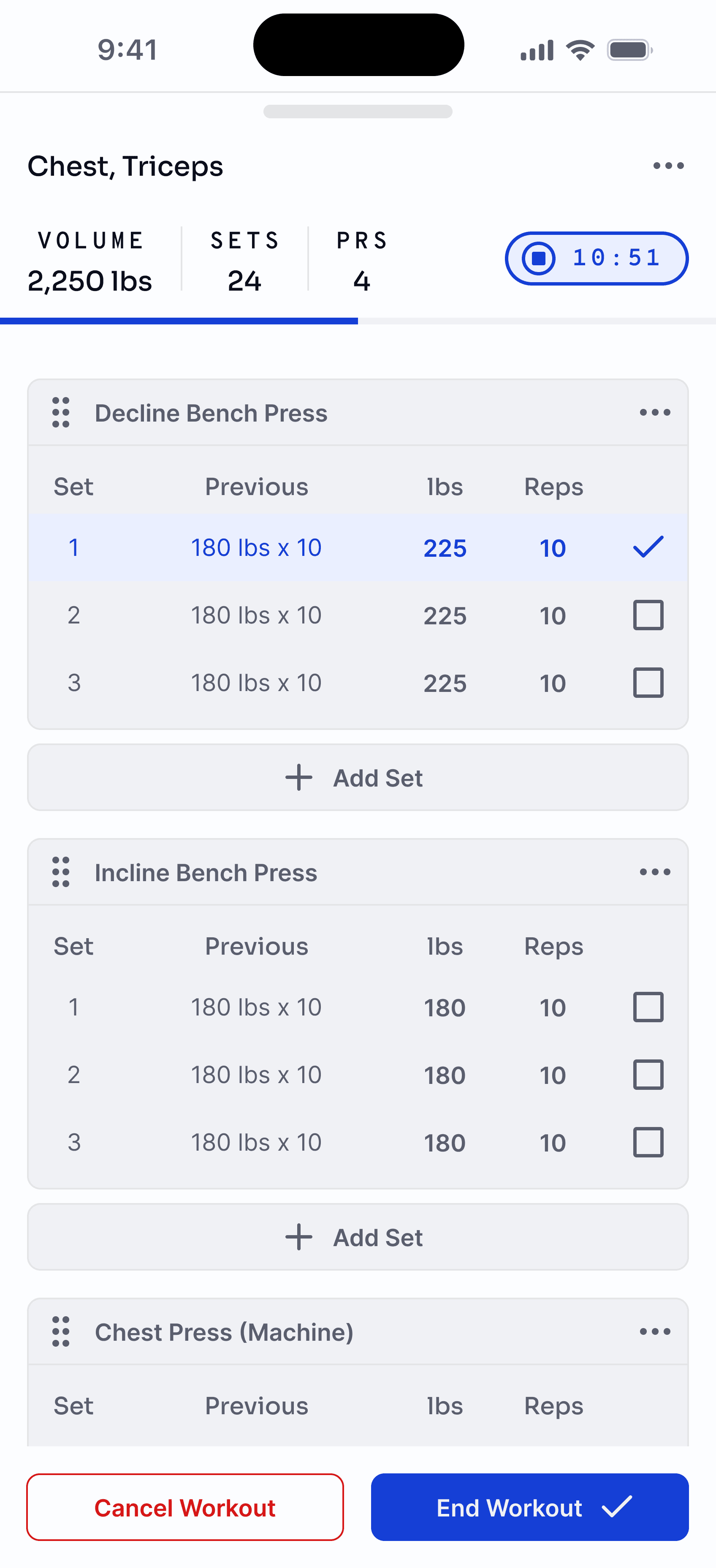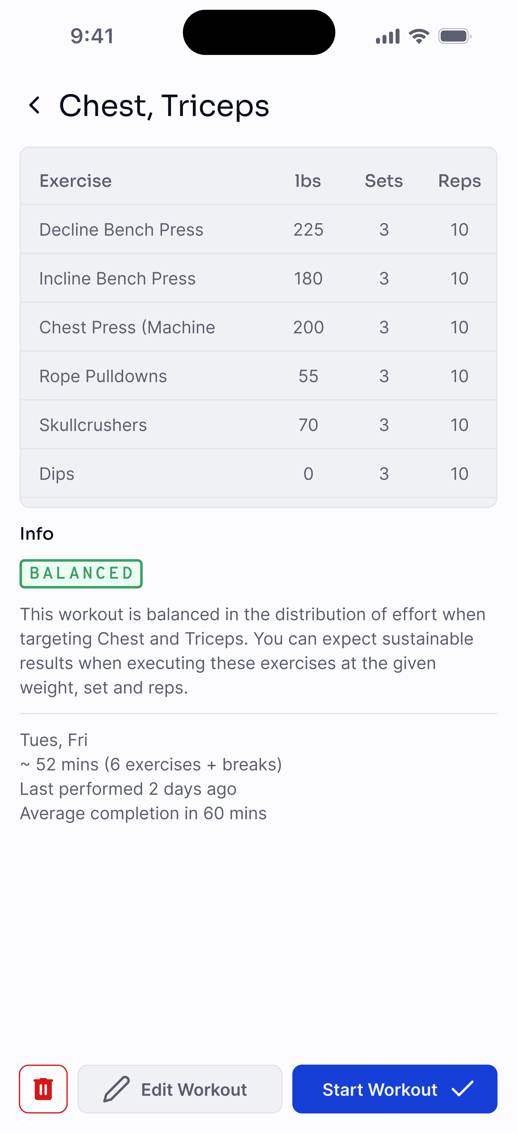 Strong has a clean, straightforward design and its freemium version lets users manually create a fixed set of workouts. However, goal-setting is limited to text and isn’t connected to actual workouts or exercises. While Strong tracks solid historical data, it doesn't connect how previous workouts led to a user’s goals.